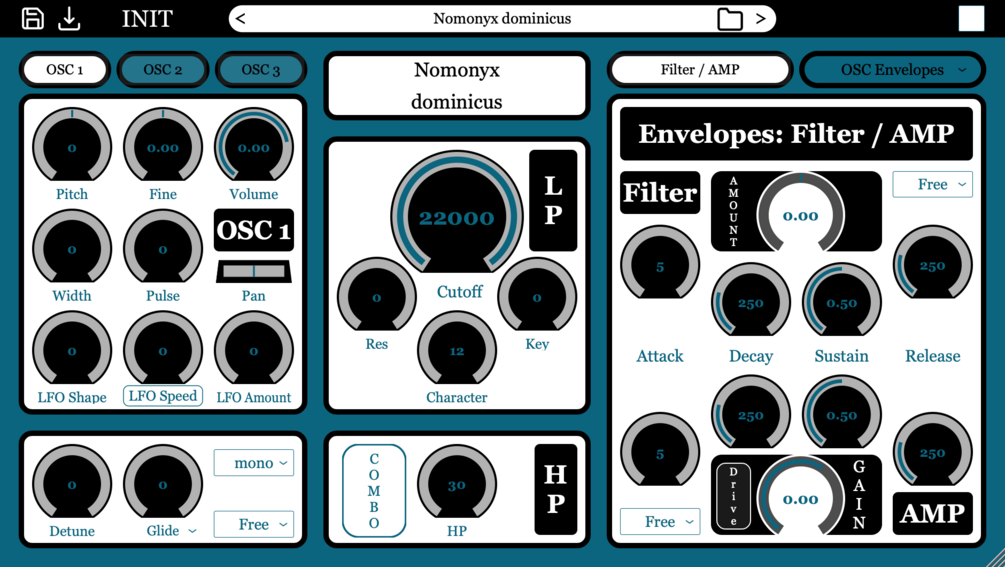 Nomonyx dominicus is a subtractive Synthesizer with tree virtual analog wavetable like oscillator and a filter with adjustable character.